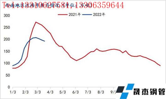 截至3月24日,西南地區建筑厚壁無縫鋼管社會庫存總量192.18萬噸,已經連續三周下降,庫存拐點基本顯現,庫存峰值于3月3日出現,為207.08萬噸,較去年庫存高點減少64.75萬噸,降幅達23.82%。主要原因是:1、西南地區價格全國洼地,北方無縫厚壁鋼管廠家對西南地區資源投放量大幅減少,尤其是川渝地區;2、廣東廣西等區域價格高企,云南無縫厚壁鋼管廠家維持低庫存運轉,加大對兩廣等周邊區域資源投放;3、受廢鋼不足、環保檢查、利潤低等因素影響,西南地區電爐企業春節放假時間較往年提前,總體產量下降;4、冬儲價格偏高,商家對春節后需求普遍擔憂,冬儲操作較為謹慎,冬儲體量較往年偏低。綜上原因,西南地區社會庫存較去年低。