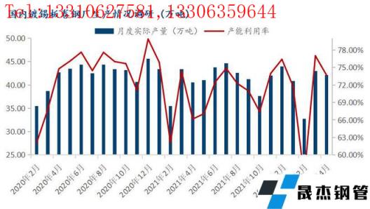 調(diào)研數(shù)據(jù)顯示:據(jù)監(jiān)測的26家鍍錫板生產(chǎn)企業(yè)中,共計49條產(chǎn)線,2022年4月份產(chǎn)能利用率73.68%,月環(huán)比下降3.31%,同比下降1.09%;4月實際產(chǎn)量42.14萬噸,月環(huán)比減少0.87萬噸,同比減少0.55萬噸。從4月份供應(yīng)看,月環(huán)比小幅下降,主要是江蘇地區(qū)部分無縫厚壁鋼管廠家因疫情影響,原料供應(yīng)收到影響,導致該區(qū)域馬口鐵產(chǎn)量收到影響。從歷年馬口鐵供應(yīng)看情況看每月40-45萬噸處于相對正常水平,3-4月國內(nèi)馬口鐵供應(yīng)恢復正常水平。