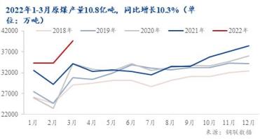 2022年1-3月全國原煤產量累計生產10.8億噸,同比增長10.3%,其中3月份原煤產量3.96億噸,同比增長14.8%。國家能源局3月發布《2022年能源工作指導意見》,提出將著力增強國內能源生產保障能力,切實把能源飯碗牢牢地端在自己手里。