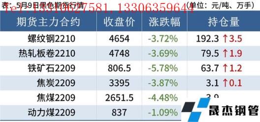 熱軋板卷:5月9日,全國24個主要城市4.75mm熱軋板卷均價5067元/噸,較上個交易日下跌60元/噸。綜合來看,美聯儲加息和縮表落地限制了國內貨幣寬松的空間,國內多地區疫情爆發,國內外的雙重因素導致情緒不佳,無縫厚壁鋼管廠家目前面臨虧損的局面,焦煤焦炭的首輪提降已經落地,原料端價格支撐進行弱化,原料與成材呈現負反饋。預計下半年經濟沖擊影響依舊,短期成材或將維持偏弱態勢。因此,預計全國熱軋板卷10日價格維持下行趨勢。
