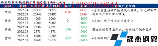 4月西南地區(qū)建筑厚壁無(wú)縫鋼管價(jià)格區(qū)間震蕩運(yùn)行,整體均價(jià)小幅抬升,部分無(wú)縫厚壁鋼管廠家利潤(rùn)小幅提升。其中云貴區(qū)域由于建材價(jià)格相對(duì)偏低,廢鋼價(jià)格較高,大多無(wú)縫厚壁鋼管廠家仍處于虧損狀態(tài),停產(chǎn)檢修情況較多。具體來(lái)看,4月四川地區(qū)電弧爐無(wú)縫厚壁鋼管廠家日均產(chǎn)量小幅增加,重慶地區(qū)電弧爐無(wú)縫厚壁鋼管廠家生產(chǎn)無(wú)明顯變化,云貴地區(qū)電弧爐無(wú)縫厚壁鋼管廠家產(chǎn)量小幅下降。