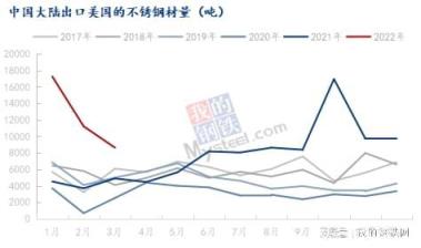 2021年,中國大陸出口美國的不銹鋼制品的量總計22萬噸(占大陸出口總量的20.3%),2022年1-3月,該量約5.2萬噸(占大陸出口總量的22.3%),同比增加6.8%。