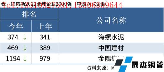免責聲明:本網站(山東聊城晟杰無縫鋼管廠www.centurybiz.cn)刊載的“中國3家水泥企業上榜福布斯2022全球企業2000強”等均源于網絡,版權歸原作者所有,且僅代表原作者觀點,本文所載信息僅供參考。轉載僅為學習與交流之目的,如無意中侵犯您的合法權益,請及時聯系刪除。本網站刊登此篇文章并不意味著本站贊同其觀點或證實其內容的真實性,我們不對其科學性、嚴肅性等作任何形式的保證。如果侵犯了您的版權,請盡快聯系我們予以撤銷,謝謝合作!