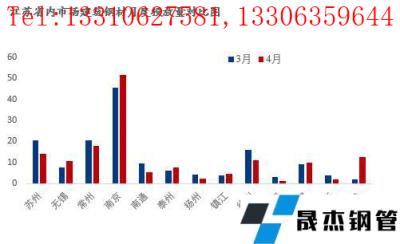 由上圖可見,4月江蘇省內無縫厚壁鋼管廠家在江蘇省13個城市投放建筑厚壁無縫鋼管量占總投放量的76.31%,省外無縫厚壁鋼管廠家占江蘇省總投放量的23.69%。同時,從調研數據來看,4月江蘇市場建筑厚壁無縫鋼管實際投放總量較3月減少4.36萬噸萬噸,降幅約2.76%。