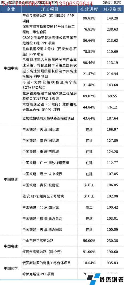 據(jù)梳理,中國(guó)中鐵、中國(guó)鐵建、中國(guó)電建、中國(guó)化學(xué)4家企業(yè)公布了在建重大項(xiàng)目情況,具體如下:
