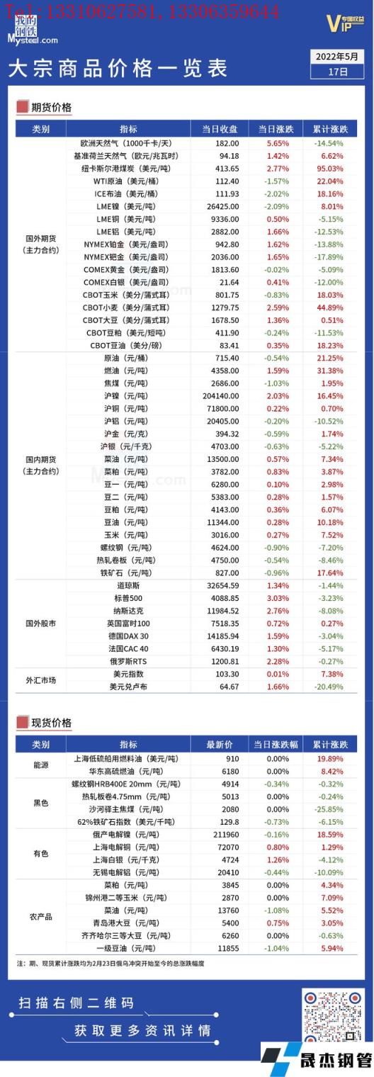 免責聲明:本網站(山東聊城晟杰無縫鋼管廠www.centurybiz.cn)刊載的“俄烏局勢丨大宗商品價格一覽表(5月17日)”等均源于網絡,版權歸原作者所有,且僅代表原作者觀點,本文所載信息僅供參考。轉載僅為學習與交流之目的,如無意中侵犯您的合法權益,請及時聯系刪除。本網站刊登此篇文章并不意味著本站贊同其觀點或證實其內容的真實性,我們不對其科學性、嚴肅性等作任何形式的保證。如果侵犯了您的版權,請盡快聯系我們予以撤銷,謝謝合作!