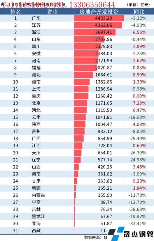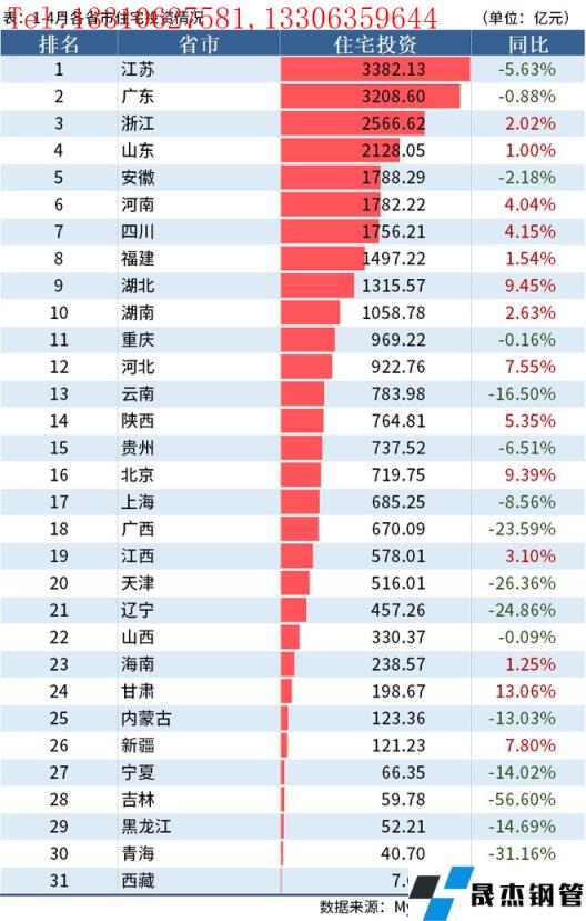 住宅投資方面,投資額超千億的有10個(gè)省市,其中江蘇、廣東和浙江分別以3382.13億元、3208.6億元、2566.62億元的投資額位排名前三。累計(jì)同比方面,有10個(gè)省市同比降幅超10%,其中降幅最大的依然是吉林省,同比下降56.6%;同比增幅超10%的僅有甘肅一省,同比增長13.06%。