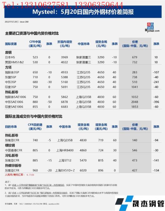 免責聲明:本網站(山東聊城晟杰無縫鋼管廠www.centurybiz.cn)刊載的“2022年05月20日日報:國內外鋼材_無縫鋼管價差匯總(2022.5.20)”等均源于網絡,版權歸原作者所有,且僅代表原作者觀點,本文所載信息僅供參考。轉載僅為學習與交流之目的,如無意中侵犯您的合法權益,請及時聯系刪除。本網站刊登此篇文章并不意味著本站贊同其觀點或證實其內容的真實性,我們不對其科學性、嚴肅性等作任何形式的保證。如果侵犯了您的版權,請盡快聯系我們予以撤銷,謝謝合作!