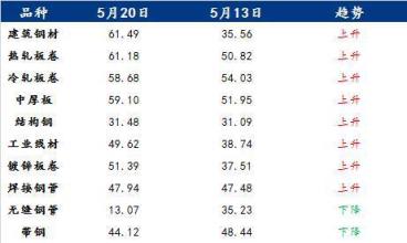 具體各品種指數來看,5月20日建筑厚壁無縫鋼管情緒指數為61.49,較5月13日回升25.93;熱軋板卷情緒指數為61.18,較5月13日回升10.36;冷軋板卷情緒指數為58.68,較5月13日回升4.65;中厚板情緒指數為59.1,較5月13日回升7.15;結構鋼情緒指數為31.48,較5月13日回升0.39;工業線材情緒指數為49.62,較5月13日回升10.88;鍍鋅板卷情緒指數為51.39,較5月13日回升13.88;焊接厚壁鋼管情緒指數為47.94,較5月13日回升0.46;無縫厚壁鋼管情緒指數為13.07,較5月13日回落22.16;帶鋼情緒指數為44.12,較5月13日回落4.32。