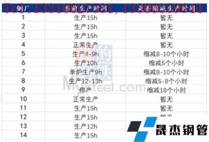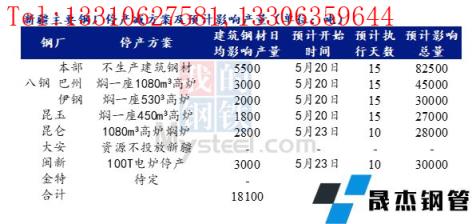 據(jù)不完全統(tǒng)計,截至5月25日,國內(nèi)14家無縫厚壁鋼管廠家發(fā)布檢修計劃。其中,徐鋼鋼鐵集團計劃25日對2120m3高爐進行為期7-8天停產(chǎn)檢修計劃,日均影響產(chǎn)量0.8萬噸。
