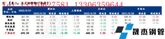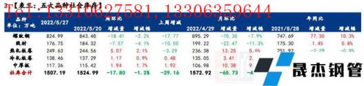 庫存方面,五大品種厚壁無縫鋼管總庫存環比上周降幅再度擴張,降至2202.69萬噸,周環比減少21.46萬噸,降幅0.96%。分品種看,建材庫存減少26.45萬噸,降幅1.8%;板材庫存增加4.99萬噸,增幅0.7%;分指標看,五大品種無縫厚壁鋼管廠家庫存環比減少3.66萬噸,降幅0.5%;五大品種社會庫存環比減少17.8萬噸,降幅1.2%。