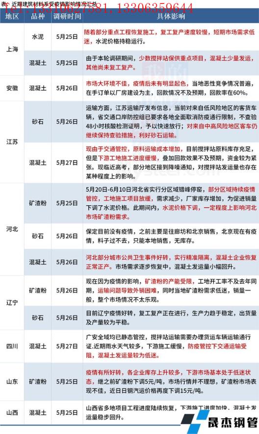 截至5月27日,據(jù)百年建筑網(wǎng)調(diào)研,8個省份建材市場受到了不同程度的影響。進入五月下旬后,施工整體進度尚未進入“減速”階段,今年整體施工進度提升緩慢,市場需求降幅拐點未來臨。目前疫情防控形勢繼續(xù)好轉(zhuǎn),建筑材料發(fā)運量有一定上升空間。現(xiàn)華東地區(qū)疫情雖得到了一定的控制,但由于交通管控因素,材料運輸仍存在一定壓力。具體情況如下:
