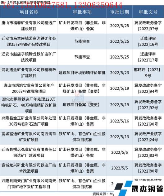 據(jù)不完全統(tǒng)計(jì),2022年5月河北省共批復(fù)鐵礦石相關(guān)項(xiàng)目11個(gè)。其中,有5個(gè)礦山開(kāi)發(fā)項(xiàng)目備案(變更),2個(gè)鐵礦石技改項(xiàng)目節(jié)能審查,2個(gè)鐵礦礦山投資項(xiàng)目核準(zhǔn),1個(gè)鐵精粉擴(kuò)建項(xiàng)目環(huán)境影響評(píng)價(jià)審批和1個(gè)煉鐵項(xiàng)目備案(變更)。