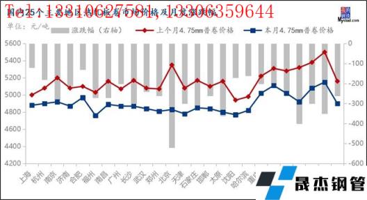圖6:國內25個主要地區熱軋板卷市場價格及月度漲跌幅