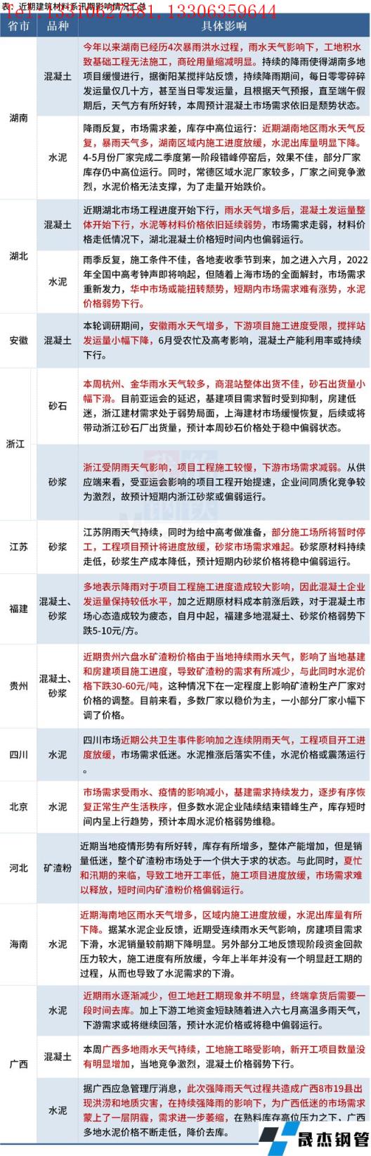 截至6月6日,據(jù)百年建筑網(wǎng)調(diào)研,華中、華東、西南、華南等12省市建材市場和建筑工地進(jìn)度受到明顯影響。短期來看隨著部分省份農(nóng)忙和大規(guī)模雨水天氣預(yù)報來臨,部分材料整體增量仍然有限,下游市場需求受到一定抑制,市場進(jìn)入需求淡季,端午節(jié)前后價格隨之出現(xiàn)下跌情況。具體情況如下: