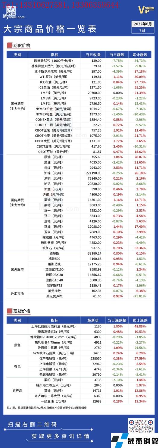 免責聲明:本網站(山東聊城晟杰無縫鋼管廠www.centurybiz.cn)刊載的“俄烏局勢丨大宗商品價格一覽表(6月7日)”等均源于網絡,版權歸原作者所有,且僅代表原作者觀點,本文所載信息僅供參考。轉載僅為學習與交流之目的,如無意中侵犯您的合法權益,請及時聯系刪除。本網站刊登此篇文章并不意味著本站贊同其觀點或證實其內容的真實性,我們不對其科學性、嚴肅性等作任何形式的保證。如果侵犯了您的版權,請盡快聯系我們予以撤銷,謝謝合作!