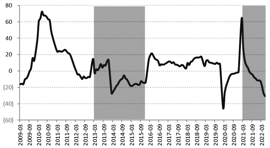 本輪地產(chǎn)調(diào)整周期始于2021年第二季度。在地產(chǎn)相關(guān)政策的驅(qū)動(dòng)下,從2021年第四季度開始,地產(chǎn)新開工面積再次進(jìn)入負(fù)增長狀態(tài),疊加疫情影響,降幅呈現(xiàn)加速下滑態(tài)勢。受此影響,螺紋鋼需求降幅可見一斑。根據(jù)上述分析,我們可以清晰看到,當(dāng)前螺紋鋼的需求表現(xiàn)和2013年有很大相似之處。