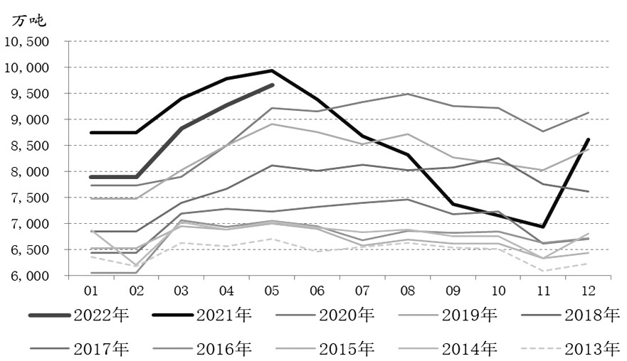 在過去近20年的時(shí)間中,我國粗鋼產(chǎn)量呈現(xiàn)逐年上升趨勢。2013年,我國粗鋼月均產(chǎn)量為6454.8萬噸。而今年1—5月,我國粗鋼月均產(chǎn)量達(dá)到8712.7萬噸。