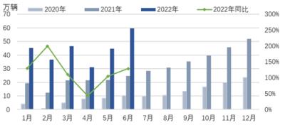 6月份,新能源汽車產(chǎn)銷分別完成59萬輛和59.6萬輛,同比均增長(zhǎng)1.3倍,產(chǎn)銷量同比增速明顯回升。1-6月份,新能源汽車產(chǎn)銷分別完成266.1萬輛和260萬輛,同比均增長(zhǎng)1.2倍,市場(chǎng)占有率21.6%。中汽協(xié)預(yù)計(jì),2022年新能源汽車銷量有望達(dá)到550萬輛,同比增長(zhǎng)56%以上。