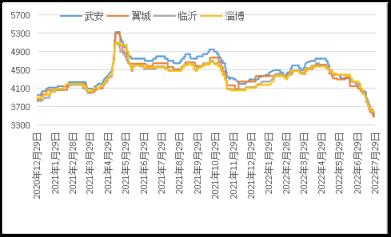 據云商平臺監測數據顯示,截至7月29日,鑄造生鐵天津地區報價3650元,較月初跌600元;武安地區報價3550元,較月初跌600元;翼城地區報價3480元,較月初跌670元;上海地區報價3900元,較月初跌600元;臨沂地區報價3600元,較月初跌600元(詳見圖3)。