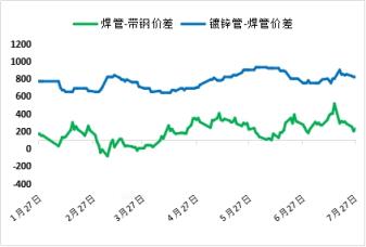 7月焊管較帶鋼價差,鍍鋅管較焊管價差走勢趨于一致。月中階段走擴后,價差空間再次收窄,月末焊管與原料價差收窄幅度大于鍍鋅管。目前管廠廠內(nèi)原料輪換周期拉長至20天左右,部分規(guī)格拉長至1個月之久,月內(nèi)出現(xiàn)停購原料3-5天的情況。結(jié)算周期內(nèi)焊管生產(chǎn)利潤平均盈利29元,架子管平均虧損7元;鍍鋅管較焊管價差收縮91元,管企綜合生產(chǎn)利潤改善不明顯。